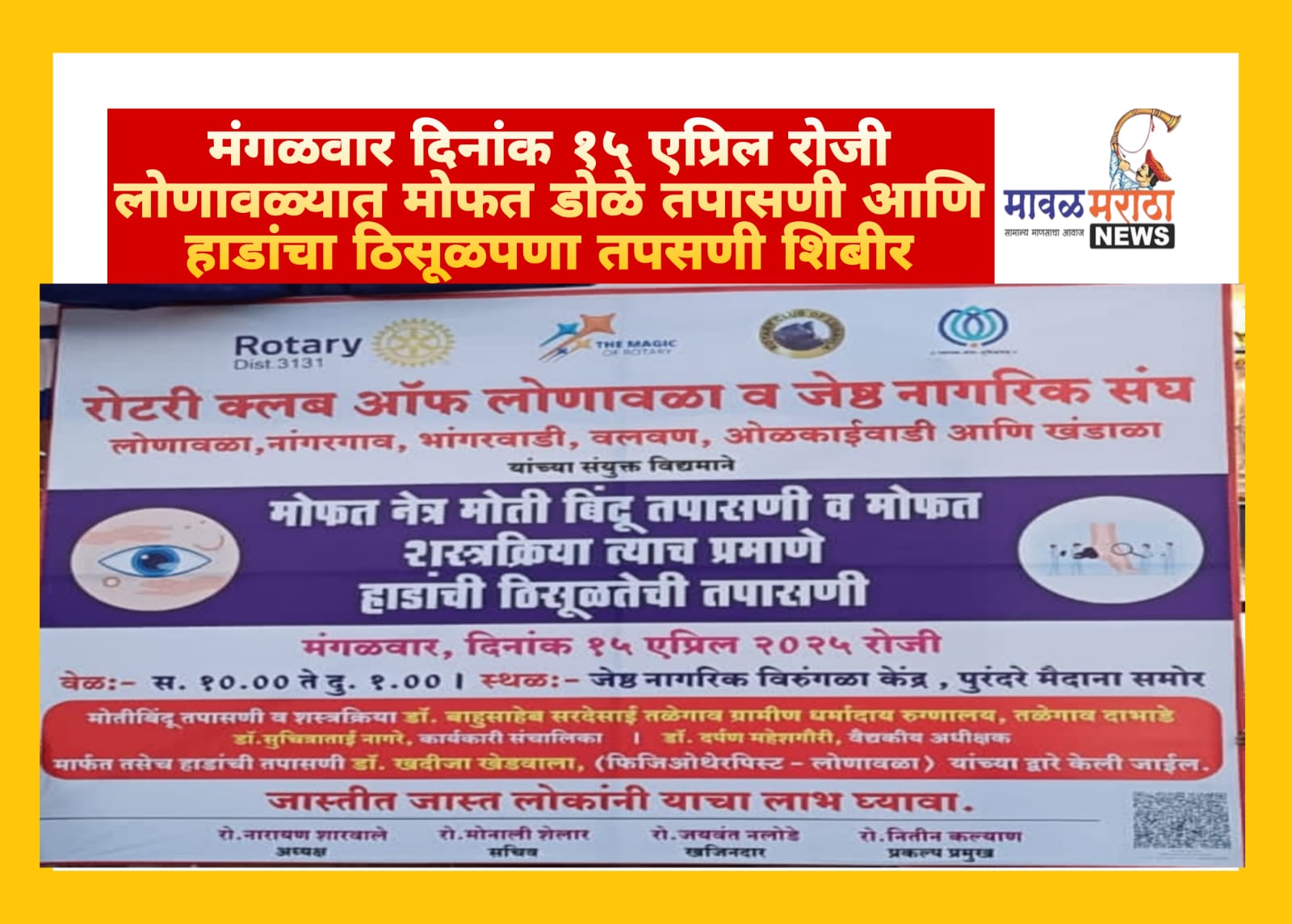 मंगळवार दिनांक १५ एप्रिल रोजी लोणावळ्यात मोफत डोळे तपासणी आणि हाडांचा ठिसूळपणा तपसणी शिबीर