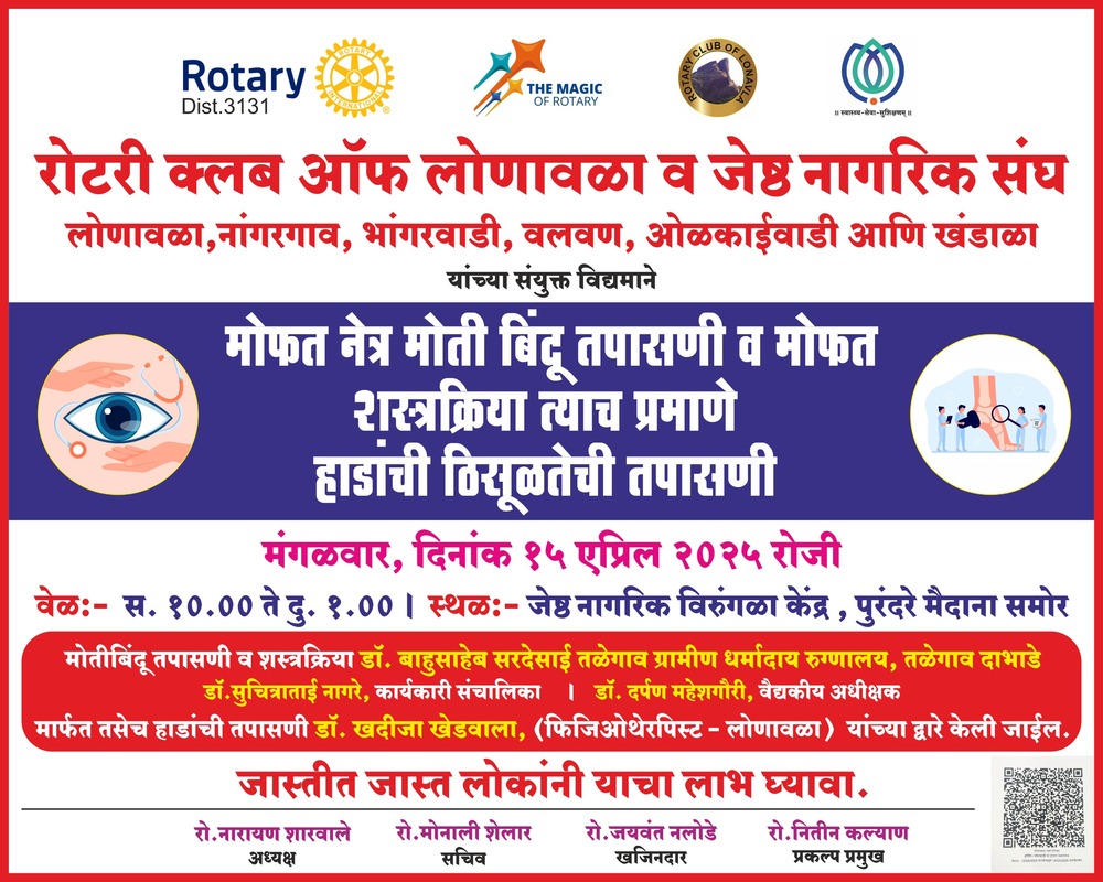 मावळ मराठा न्युज – लोणावळा,उद्या दिनांक १५ एप्रिल २०२५ वार मंगळवार रोजी सकाळी १० ते १ यावेळात येथील विरंगुळा केंद्र,लोणावळा येथे रोटरी क्लब ऑफ लोणावळा,जेष्ठ नागरिक संघ यांच्या संयुक्त विद्यमाने मोफत डोळे तपासणी,मोतीबिंदू शस्त्रक्रिया शिबीर आयोजित करण्यात आले आहे. डोळे तपासणीत मोती बिंदू शस्त्रक्रिया तळेगाव येथील भाऊसाहेब सरदेसाई चारिटेबल हॉस्पिटल येथे करण्यात येणार आहें.यावेळी डॉ खादीजा यांच्या वतीने हाडांचा ठिसूळपणा देखील तपासला जाणार आहे.तरी या शिबिराचा जास्तीत जास्त नागरिकांनी लाभ घ्यावा असे आवाहन रोटरी क्लब ऑफ लोणावळाचे अध्यक्ष नारायण शरवाळे आणि प्रकल्प प्रमुख नितीन कल्याण यांनी मावळ मराठा न्युज शी बोलताना केले आहे.