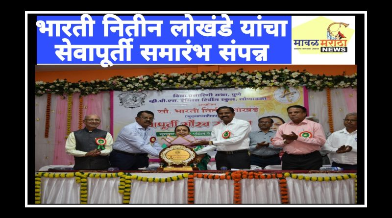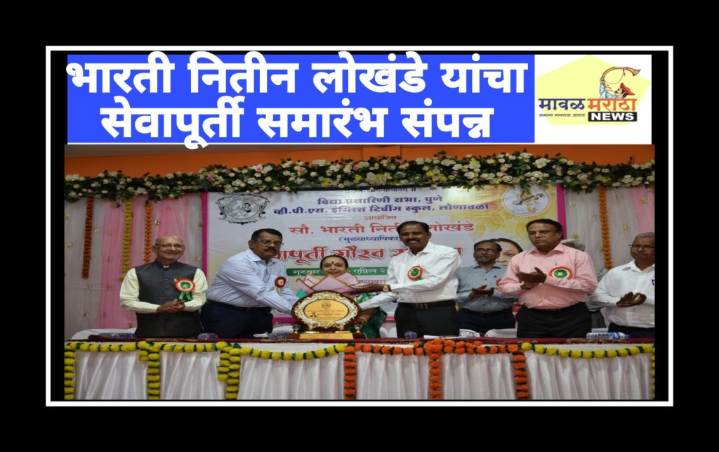 मावळ मराठा न्युज – लोणावळा,व्ही.पी.एस इंग्लिश टिचींग स्कूल लोणावळा येथील मुख्याध्यापिका भारती नितीन लोखंडे यांचा सेवापूर्ती कृतज्ञता सोहळा संपन्न झाला.गुरुवार दिनांक १७ एप्रिल २०२५ रोजी संपन्न झालेल्या या समारंभासाठी विद्या प्रसारिणी सभेच्या सर्व विद्या शाखांचे शिक्षक,मुख्याध्यापक,शिक्षकेतर कर्मचारी तसेच सौ.लोखंडे यांचे कुटुंबीय उपस्थित होते.३५ वर्ष शैक्षणिक क्षेत्रात कार्यरत असणाऱ्या सौ.लोखंडे यांनी पुणे व लोणावळा येथील संस्थेच्या विविध विद्याशखांमध्ये आपले शैक्षणिक कार्य केले.एक उपक्रमशील शिक्षिका,आदर्श मुख्याध्यापिका असा नावलौकिक त्यांचा आहे.या सोहळ्याच्या निमित्ताने सर्व शिक्षक कर्मचारी यांचेकडून सौ.लोखंडे यांचा मानपत्र देऊन सन्मान करण्यात आला.सेवापूर्तीच्या या कार्यक्रमासाठी संस्थेचे कार्यवाह डॉ.श्री.सतीश गवळी सर,सहकार्यवाह श्री.विजय भुरके सर,शाळा समिती सदस्य श्री.गिरीश पारख,श्री.धीरूभाई टेलर, व्ही.पी.एस हायस्कुल चे प्राचार्य श्री.महिंद्रकर सर,उपमुख्याध्यापक श्री. विसाळ सर,पर्यवेक्षक श्री. रसाळ सर,श्री.गडकर सर,वरिष्ठ लिपीक श्री.कुंडलिक आंबेकर सर,व्ही.पी.एस प्राथमिक विद्यालयाच्या मुख्याध्यापिका जाधव मॅडम,प्रा. नाथ हरी पुरंदरे विद्यालयाच्या मुख्याध्यापिका घोलप मॅडम इ.मान्यवर उपस्थित होते.कार्यक्रमाचे नियोजन सर्व शिक्षक कर्मचारी यांनी केले.सूत्रसंचालन सौ. प्रीती चुडासमा व श्री.अनिकेत रासकर यांनी केले.