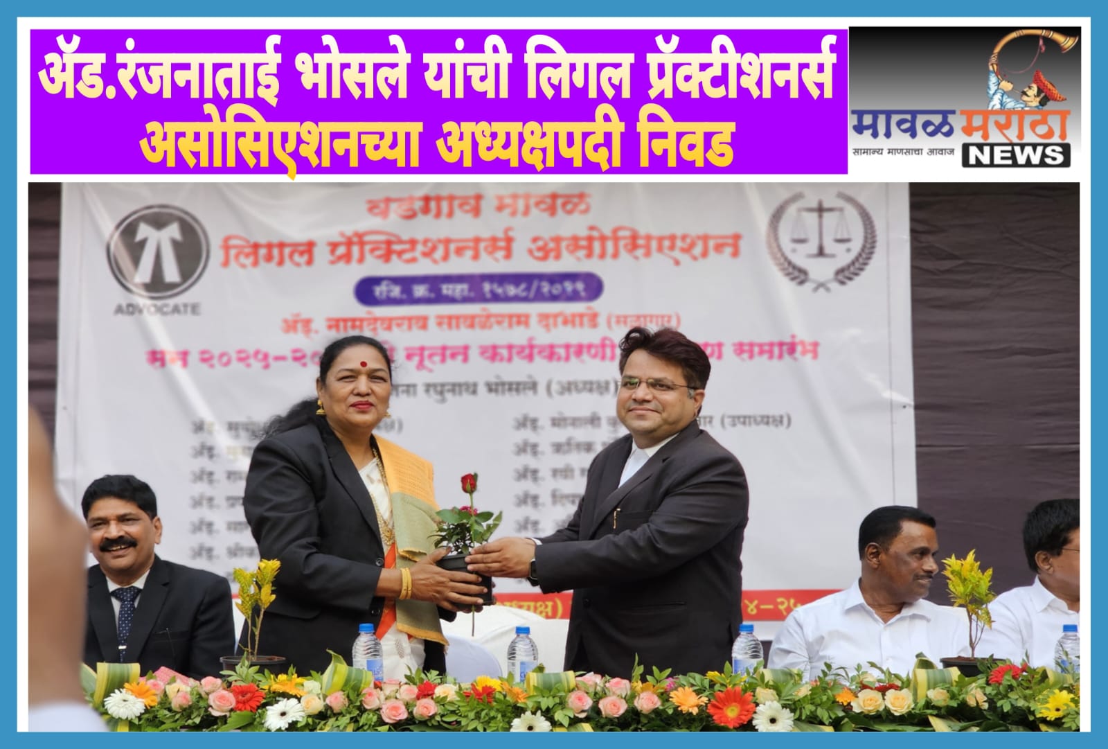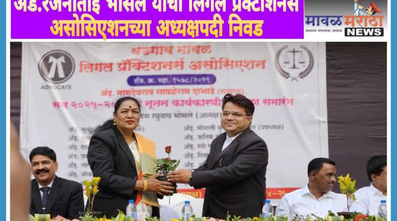 मावळ मराठा न्युज – वडगाव मावळ लिगल प्रॅक्टीशनर्स असोसिएशनच्या सन २०२५-२६ साठीच्या अध्यक्षपदी तळेगाव दाभाडे नगरपरिषदेच्या माजी नगराध्यक्षा ज्येष्ठ ॲड. रंजना भोसले यांची सर्वानुमते बिनविरोध निवड करण्यात आली. वडगाव न्यायालयातील वकील बाररूम मध्ये विशेष सभेचे आयोजन करण्यात आले. या सभेमध्ये ही निवड करण्यात आली.या बैठकीसाठी जेष्ठ विधिज्ञ ऍड. नामदेवराव दाभाडे, ऍड. अशोक ढमाले, ऍड. सिताराम बवरे, अॅड. विलास गोखले, ऍड. दिपक चौधरी, ऍड. धनंजय कोद्रे, ऍड. सोमनाथ पवळे, ऍड. दिलीप पंडीत, ऍड. अशफाक काझी, ऍड. शिवदास मोरे आदी उपस्थितीत बिनविरोध निवड करणेत आली. या वेळी मान्यवरांसह अनेक वकील बंधू-भगिनी मोठ्या संख्येने उपस्थित होते.वडगाव न्यायालयातील वकीलांसाठी काम करणारी एक नामांकित संस्था म्हणून नावलौकिक असलेल्या वडगाव मावळ लिगल प्रक्टीशनर्स असोसिएशनच्या सन २०२५-२६ साठीच्या अध्यक्षपदी एक अभ्यासू वकील व समाजकार्याची विशेष आवड असलेल्या तसेच अनुभवी व ज्येष्ठ ॲड .रंजनाताई भोसले यांची सर्वानुमते बिनविरोध निवड करण्यात आली. असोसिएशनचे मावळते अध्यक्ष ॲड. सोमनाथ पवळे यानी अध्यक्षपदाची सुत्रे ॲड.भोसले यांचेकडे सोपवली. वडगांव न्यायालयाच्या वकील बार रूममध्ये असोसिएशनच्या विशेष बैठकीचे आयोजन करण्यात आले. असोसिएशनच्या नूतन कार्यकारिणीची निवड व पदग्रहण सोहळ्याचे आयोजन यावेळी करण्यात आले.यावेळी असोसिएशनच्या कार्यकारिणी पदाधिकारी व सदस्य म्हणून ॲड. रंजनाताई भोसले (अध्यक्ष), ॲड. सुबोध कालेकर (उपाध्यक्षा), ॲड.मोनाली कुलकर्णी-शेलार (उपाध्यक्षा), अँड प्रणोत्ती पिंगळे (सचिव), ॲड. राम शहाणे (सचिव), ॲड. मुनाफ शेख (खजिनदार)यांची निवड करण्यात आली.तर सदस्य म्हणून ॲड. सागर भेटे,ॲड. श्रीकांत सावंत, ॲड. योगेश गायकवाड, ॲड. नऋतिक पंडीत, ॲड. रवि गायकवाड, ॲड. दिपाली आगळे, ॲड. अनिता पळनिटकर, ॲड. सुजाता घारे, ॲड. किरण बेनगुडे असोसिएशनच्या सर्व आजी माजी पदाधिकाऱ्याचा यावेळी सन्मान करण्यात आला. अनेक मान्यवरांनी आपले मनोगत व्यक्त केले व असोसिएशन करत असलेल्या सामाजिक कार्याचे सर्वांनीच कौतुक केले. सर्व मान्यवरांनी यावेळी नवनिर्वाचित कार्यकारिणी पदाधिकाऱ्यांना शुभेच्छा दिल्या.