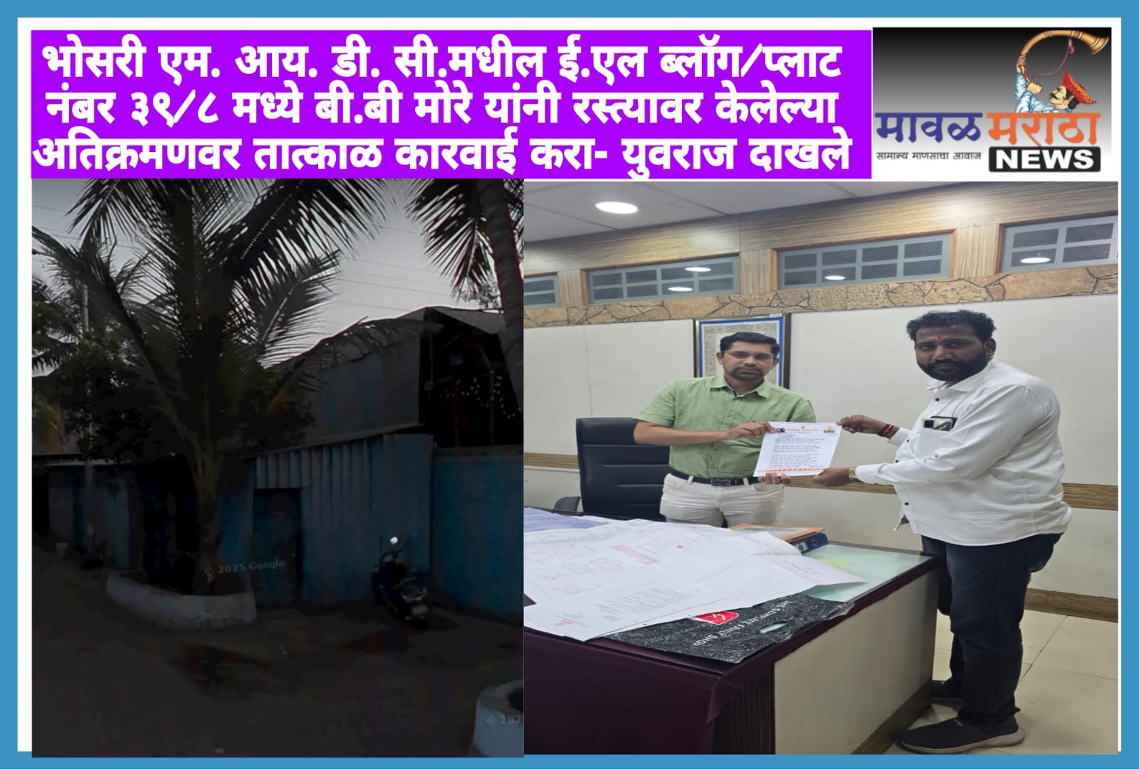 भोसरी एम. आय. डी. सी.मधील ई.एल ब्लॉग/प्लाट नंबर ३९/८ मध्ये बी.बी मोरे यांनी रस्त्यावर केलेल्या अतिक्रमणवर तात्काळ कारवाई करा.- युवराज दाखले