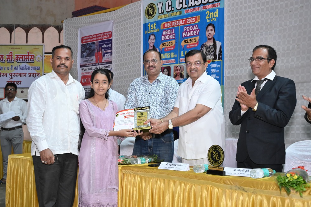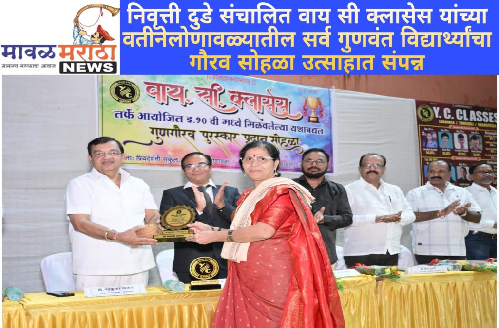 मावळ मराठा न्युज – लोणावळा,वाय. सी. क्लास हा मागील कित्येक वर्षापासून दरवर्षी लोणावळा परिसरातील सर्व शाळांमधील इयत्ता दहावी मध्ये उत्तीर्ण झालेल्या प्रथम तीन क्रमांकाच्या विद्यार्थ्यांचे प्रमाणपत्र आणि सन्मान चिन्ह देऊन त्यांना सन्मानित करत आहे. यावर्षीही वाय.सी. क्लासेस लोणावळा तर्फे आयोजित इयत्ता दहावी मध्ये मिळविलेल्या यशाबद्दल गुणगौरव पुरस्कार प्रदान सोहळा वार रविवार दिनांक १ जून २०२५ रोजी दु. ४ वाजता लोणावळा नगरपालिकेचे प्रियदर्शनी संकुल लोणावळा, गावठाण येथे आयोजित करण्यात आला. सदर कार्यक्रमासाठी लोणावळा नगरपरिषदेचे माजी उपनगराध्यक्ष श्री. श्रीधर पुजारी, मा.शिक्षण सभापती लोणावळा नगरपरिषद श्री. जितेंद्र भाई कल्याणजी,ज्येष्ठ समाजसेवक श्री.नंदकुमार वाळंज, ॲड. श्री.संजय पाटील,संपादक एम एन न्यूज,गुरुकुल हायस्कूल लोणावळ्याचे मुख्याध्यापक श्री.खुरंगे सर,ज्येष्ठ पत्रकार श्री विशाल विकारी, श्री विजय रसाळ पर्यवेक्षक व्ही.पी.एस. हायस्कूल, लोणावळा,श्री सुनील म्हस्के, मावळ भारताचे पत्रकार श्री गुरुनाथ नेमाने आदी मान्यवरांच्या उपस्थितीत २०२५ चा गुणगौरव पुरस्कार प्रदान सोहळा संपन्न झाला. सदर कार्यक्रमात विविध क्षेत्रात विशेष कामगिरी करणारे सन्माननीय मान्यवरांचाही सन्मान करण्यात आला. त्यामध्ये कलाक्षेत्रातील श्री अतिश बजरंग थोरात, लेखन क्षेत्र सौ वैजयंती जगताप, वयाच्या ५८ व्या वर्षी इयत्ता बारावी पास झालेल्या बनताबाई काजळे – चोपडे तसेच एम पी एस सी स्पर्धा परीक्षेमध्ये शेतकरी कुटुंबातील श्री दत्ता विठ्ठल शेडगे आदींचा वाय. सी. क्लासेस कडून विशेष सन्मान करण्यात आला.सदर कार्यक्रमात वाय. सी. क्लासेसचे संचालक श्री निवृत्ती दुडे यांनी प्रास्ताविकेद्वारे क्लासचा सुरुवातीपासूनचा प्रवास ते आजची विद्यार्थी आणि आई-वडिलांच्या समोरील आव्हाने याविषयी मार्गदर्शन केले. तसेच,विविध मान्यवरांकडून विद्यार्थ्यांना भावी काळासाठी शुभेच्छा तसेच येणाऱ्या काळातील विविध आव्हाने कशी पार करता येईल याविषयी योग्य मार्गदर्शन करण्यात आले. वाय. सी. क्लास हा मावळातला एकमेव असा खाजगी क्लास आहे की जो विद्यार्थ्यांच्या गुणांचा गौरव करतो. अशा प्रकारचे गौरवोद्गार सर्व मान्यवरांनी कौतुकाने केले. वाय.सी. क्लासेसची विद्यार्थिनी अबोली बोडके हिने इयत्ता बारावी विज्ञान शाखेत ९३ .८३ % मिळून लोणावळा परिसरात प्रथम क्रमांक मिळवल्याने तिचे सर्वांकडून कौतुक करण्यात आले. तसेच,पूजा पांडे वाय सी क्लासेसच्या विद्यार्थिनीने अकाउंट या विषयात १०० पैकी १०० गुण मिळवून राज्यात प्रथम क्रमांक मिळवण्याचा मान मिळविल्याने तिचाही सन्मान करण्यात आला. वाय. सी. क्लासेस कडून अथक परिश