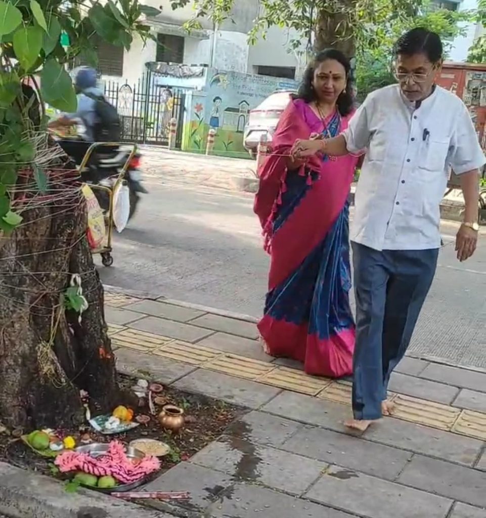 मावळ मराठा न्युज -पिंपळे गुरव येथे गेल्या दहा वर्षापासून पुरुष वटपौर्णिमा मानवी हक्क संरक्षण आणि जाग्रतीच्या वतीने होत असते पण हे वर्ष आपवाद ठरले आहे कारण शहराध्यक्ष अण्णा जोगदंड यांची प्रकृती ठीक नसल्याने त्यांनी पुरुष वटपौर्णिमा यावर्षी होणार नाही म्हणून कार्यकर्ते व नागरिकांना संदेश दिला पण घेतलेला वसा कोणत्या परिस्थितीत बंद करायचा नाही असा निर्णय घेतला. स्त्री पुरुष समानतेसाठी वटपौर्णिमा साजरी करण्याचा पायंडा बंद पण झाला नाही पाहिजे म्हणून आम्ही दोघा पती-पत्नी वटपौर्णिमा साजरी केली असे आण्णा जोगदंड म्हणाले पुढे ते म्हणाले की,कोणताही कार्यक्रम घ्यावयाचा म्हटले की नियोजन आणि ताणतणाव येतोच यावर पर्याय म्हणून शहरातील पहिले पती-पत्नी गुणवंत कामगार असलेले दापत्य अण्णा जोगदंड व संगीता योगदान दोघांनी फेऱ्या मारून वटवृक्षला फेऱ्या मारून पुरुष वटपौर्णिमा साजरी केली फक्त स्त्री पुरुष समानतेसाठी वटपौर्णिमा साजरी केल्याचे त्यांनी सांगितले .कोणाच्या भावना दुखावण्याचा आमचा मुळीच हेतू नाही असे शहराध्यक्ष आण्णा जोगदंड यावेळी सांगितले. त्यांनी महिलांना आवाहन केली आहे, की झाडांच्या फांद्या तोडून पर्यावरणाचा ऱ्हास करू नये असा मौलिक सल्ला त्यांनी दिला .यावेळी गुणवंत कामगार संगीता जोगदंड म्हणाल्या की मला अभिमान वाटतो माझे पती यांनी माझ्या बरोबर एकसाथ फेऱ्या मारून वटपौर्णिमा केली.