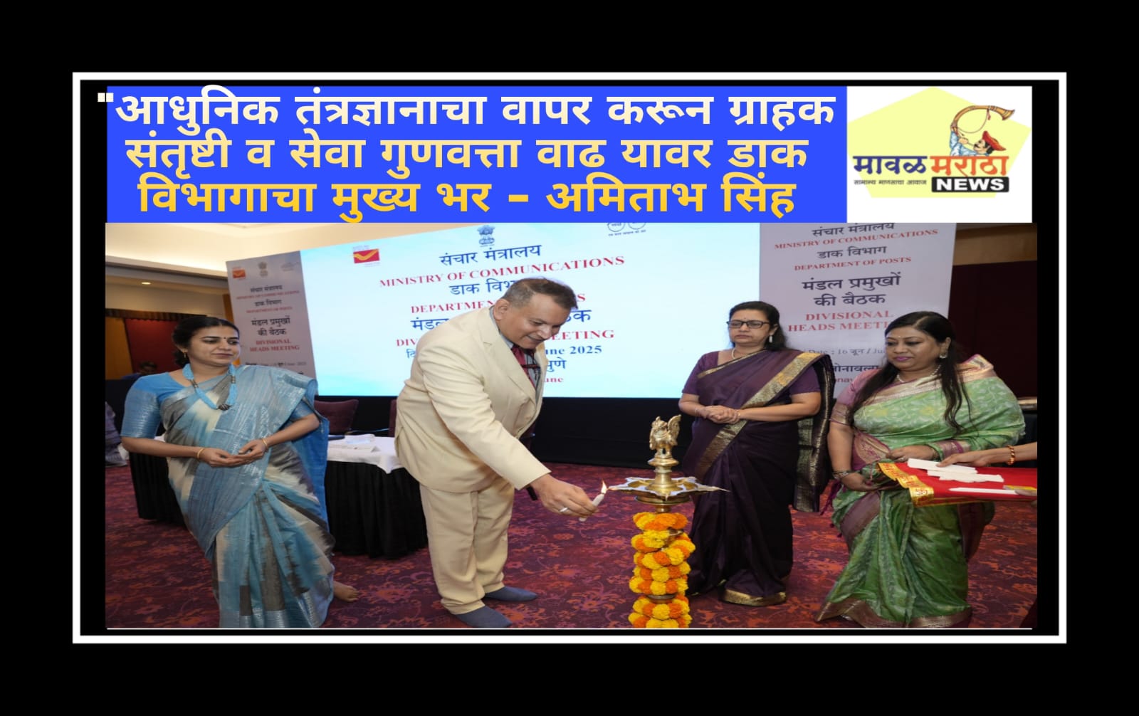 मावळ मराठा न्युज-लोणावळा,दिनांक १६ जून २०२५ रोजी लोणावळा येथे भारतीय टपाल विभागाच्या महाराष्ट्र आणि गोवा टपाल सर्कलमधील विभाग प्रमुखांची बैठक आयोजित करण्यात आलेल्या या बैठकीच्या अध्यक्षस्थानी माननीय श्री अमिताभ सिंह, मुख्य पोस्टमास्तर जनरल, महाराष्ट्र व गोवा सर्कल हे होते. या आर्थिक वर्षातील पहिली बैठक होती.या बैठकीस महाराष्ट्र आणि गोवा टपाल सर्कलमधील सुश्री जयति समद्दार (जी.एम. फायनान्स महाराष्ट्र व गोवा सर्कल ),सुश्री शोभा मधाळे (पोस्टमास्तर जनरल, नागपूर क्षेत्र), सुश्री सिमरन कौर (निदेशिका, मुख्यालय), श्री अभिजित बनसोडे (निदेशक, पुणे क्षेत्र), श्री अजिंक्य काळे (निदेशक, छत्रपती संभाजीनगर क्षेत्र), श्री आर. पी. पाटील (निदेशक, गोवा क्षेत्र) आणि डॉ अभिजित इचके (निदेशक, नवी मुंबई क्षेत्र) हे मान्यवर अधिकारी आणि सर्व विभागीय प्रमुख उपस्थित होते. बैठकीची सुरवात दीप प्रज्ज्वलनाने झाली आणि उपस्थित मान्यवरांचे स्वागत सुश्री सिमरन कौर, निदेशिका (मुख्यालय) यांनी केले. आपल्या स्वागतपर भाषणात त्यांनी विभागाची स्वावलंबन आणि नफा मिळवून देणारे संघटन अशी ओळख निर्माण व्हावी यासाठी आपण एकत्रितपणे काम करण्याची आवश्यकता असल्याचे सांगितले. IT 2.0 या प्रकल्पाची दिशा तसेच बचत बँक, विमा, व्यवसाय वृद्धी या संबंधीची ध्येय धोरणे आणि नोडल डिलिव्हरी सेंटर (NDC), इंडिपेंडट डिलिव्हरी सेंटर (IDC) प्रणाली आणि टपाल वितरणासाठी ई-वाहनांचा उपयोग या प्रमुख मुद्द्यांवर या बैठकीत भर देण्यात आला. श्री अमिताभ सिंह, मुख्य पोस्टमास्तर जनरल, महाराष्ट्र आणि गोवा सर्कल यांनी आपल्या मार्गदर्शनपर भाषणात प्रामुख्याने संचार मंत्रालयाच्या दृष्टीकोनाला आणि “डाक सेवा–जन सेवा” या ब्रीदवाक्याला अनुसरून ग्राहकांना तत्पर सेवा देण्याची प्रणाली आणि तक्रार निवारण करताना सर्वतोपरी काळजी घेतली जावी यावर विशेष भर दिला. त्यांनी आपल्या भाषणात ग्राहक आणि कर्मचारी यांच्या आरोग्याच्या दृष्टीने पोस्ट ऑफिस स्वच्छ ठेवली पाहिजेत या उद्देशाने पोस्ट ऑफिस मध्ये स्वच्छता अभियान खऱ्या अर्थाने अमलात आणण्यात यावे असे नमूद केले. या बैठकीदरम्यान विविध विभाग प्रमुखांनी आपापल्या विभागाची उद्दिष्टे आणि ध्येय धोरणे याबाबत सादरीकरण केले. सदर बैठकीचे आयोजन श्री अभिजीत बनसोडे, निदेशक (पुणे क्षेत्र) यांच्या मार्गदर्शनाखाली करण्यात आले.