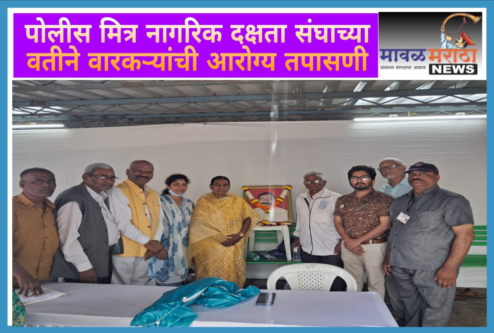 मावळ मराठा न्युज-पिंपरी (प्रदीप गांधलीकर) दिनांक २० जून २०२५) आषाढी वारीनिमित्त पोलीस मित्र नागरिक दक्षता संघ यांच्या वतीने हनुमान मंदिर परिसर, निगडी गावठाण येथे गुरुवार,दिनांक १९ जून २०२५ रोजी वारकऱ्यांची मोफत आरोग्यतपासणी आणि औषध वाटप करण्यात आले. याप्रसंगी पिंपरी – चिंचवड महापालिका स्थायी समितीच्या माजी अध्यक्ष सुमन पवळे, पोलीस मित्र नागरिक दक्षता संघाचे अध्यक्ष ॲड. रमेश उंबरगे, संस्थापक – अध्यक्ष मनोहर दिवाण, महालिंग शेट्टी, शिवाजी शिर्के, राम सपाटे, रोहिदास वालगुडे, गौरी उत्तुरे, महेश स्वामी, ओंकार पवळे, नंदाराम भागवत, नंदकिशोर जगदाळे, मधुराज पवळे, ज्येष्ठ कवी प्रकाश चव्हाण, राजेंद्र घावटे, अण्णा जोगदंड, तानाजी एकोंडे, सुरेश कंक आदी मान्यवर उपस्थित होते. या उपक्रमासाठी माउली गाडे, डॉ. प्राची इंगवले, डॉ. सौरभ शिराळकर, डॉ. अभिनंदन कुमठेकर, सुप्रिया कुमठेकर, हेरंब कुमठेकर, प्रकाश गावडे, ओंकार पोळे, बाळासाहेब गाडे, भीमाशंकर उमरजे, दत्तात्रय दुवा, विजय नाटक, भरत मांडेकर, शिवाजी पवार यांनी यांनी सहकार्य केले.