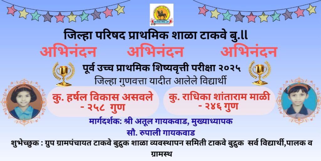 मावळ मराठा न्युज – मावळ,आंदर मावळातील टाकवे बुद्रुक जिल्हा परिषद प्राथमिक शाळेने नेहमीच विविध स्पर्धा परीक्षेमध्ये आपला ठसा उमटवला आहे सन २०२४ -२५ या शैक्षणिक वर्षांमध्ये इयत्ता ५ वी चे १९ विद्यार्थी शिष्यवृत्ती परीक्षेत उत्तीर्ण झाले आहेत तसेच त्यापैकी २ विद्यार्थिनींनी शिष्यवृत्ती जिल्हा गुणवत्ता यादी मध्ये स्थान पटकावले आहे. इयत्ता पहिलीपासूनच शाळेतील सर्व विद्यार्थ्यांच्या स्पर्धा परीक्षांची तयारी शाळेत करून घेतली जाते या शिष्यवृत्ती परीक्षेमध्ये कुमारी हर्षल विकास असवले २५८ गुण व कुमारी राधिका शांताराम माळी २४६ गुण ह्या शिष्यवृत्तीसाठी धारक ठरल्या. प्रत्येकी ५००० रुपये प्रमाणे शिष्यवृत्ती मिळणार आहे. तसेच पाचवीच्या वर्गाला मार्गदर्शन करणारे वर्गशिक्षक श्री अतुल माधव गायकवाड व सौ रुपाली अतुल गायकवाड यांनी वर्षभर सुट्टीच्या कालावधीमध्ये वर्ग चालू ठेवले. मा. केंद्रप्रमुख मा. विस्तार अधिकारी मा गटशिक्षणाधिकारी साहेब यांनी मार्गदर्शन केले. तसेच टाकवे बुद्रुक गावचे विद्यमान सरपंच श्री अविनाश असवले व शाळा व्यवस्थापन समितीचे अध्यक्ष श्री संदीप मालपोटे यांनी विद्यार्थी व मार्गदर्शक शिक्षक यांचे अभिनंदन केले. यावेळी श्री विकास असवले व सौ सारिका असवले श्री शांताराम माळी, सर्व विद्यार्थी व शिक्षक वृंद उपस्थित होते कार्यक्रमाचे सूत्रसंचालन श्रीम चारुशीला सोनवणे मॅडम यांनी केले. आभार सौ संगीता शेखरे मॅडम यांनी मानले.