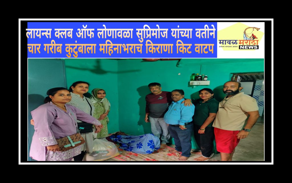 मावळ मराठा न्युज- लोणावळा,लायन्स क्लब ऑफ लोणावळा सुप्रीमोज आणि सदस्य,लायन जिल्हा अधिकारी,मित्र आणि हितचिंतक यांच्या वतीने इंदिरा नगर,म्युनिसिपल हॉस्पिटल, लोणावळा समोरील ठिकाणी येथे राहणाऱ्या आर्थिकदृष्ट्या मागासलेल्या आणि अर्ध कोमात असलेल्या ४ जणांच्या कुटुंबासाठी एक महिना पुरेल असा एक संपूर्ण रेशन किट आणि सर्व किराणा सामान मोफत देण्यात आले. १ ऑगस्ट २०२५ रोजी कुटुंबासाठी महिनाभर पुरेल असा हा रेशन आणि किराणा किट भेट देण्यात आले. सदर प्रकल्प लायन्स क्लब लोणावळा सुप्रिमोज च्या अध्यक्षा एमजेएफ सुरैया वाडीवाला यांनी प्रायोजित केला होता. एमजेएफ सुप्रीमो अमीन वाडीवाला,(डीसी इमेज बिल्डिंग),एमजेएफ सुधीर कदम,(डीसी मार्केटिंग अँड कम्युनिकेशन),रंजना पुट्टोल,(क्लब सेक्रेटर) आणि विश्वनाथ पुट्टोल यांच्या उपस्थितीत देणगी देण्यात आली. टीम सुप्रीमो लोणावळ्यातील गरीब कुटुंबांना मदत करण्यास नेहमीच तत्पर असतात.त्यांच्या या सामाजिक बांधिलकीला सलाम
