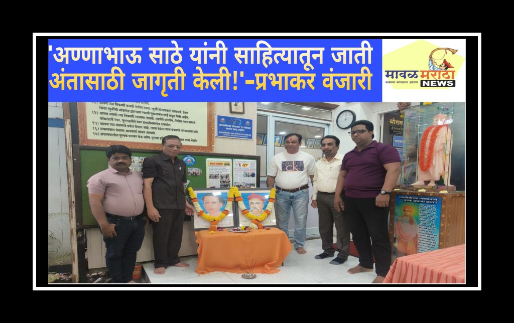 मावळ मराठा न्युज -पिंपरी (प्रदीप गांधलीकर)दिनांक-०२ऑगस्ट, २०२५’लोकशाहीर अण्णाभाऊ साठे यांनी साहित्यातून जाती अंतासाठी जागृती केली!’ असे विचार सेवानिवृत्त साहाय्यक विक्रीकर आयुक्त प्रभाकर वंजारी यांनी संत तुकारामनगर, पिंपरी येथे शनिवार, दिनांक ०२ ऑगस्ट २०२५ रोजी व्यक्त केले. लोकशाहीर अण्णाभाऊ साठे यांची जयंती तसेच लोकमान्य टिळक यांच्या पुण्यतिथी निमित्ताने सोहम् सार्वजनिक ग्रंथालयाच्या वतीने आयोजित अभिवादन कार्यक्रमात प्रमुख पाहुणे म्हणून प्रभाकर वंजारी बोलत होते. सामाजिक कार्यकर्ते किरण सुवर्णा, अमीर शेख, रामेश्वर राऊत, सोहम् सार्वजनिक ग्रंथालयाचे अध्यक्ष जगन्नाथ नेरकर यांची प्रमुख उपस्थिती होती.