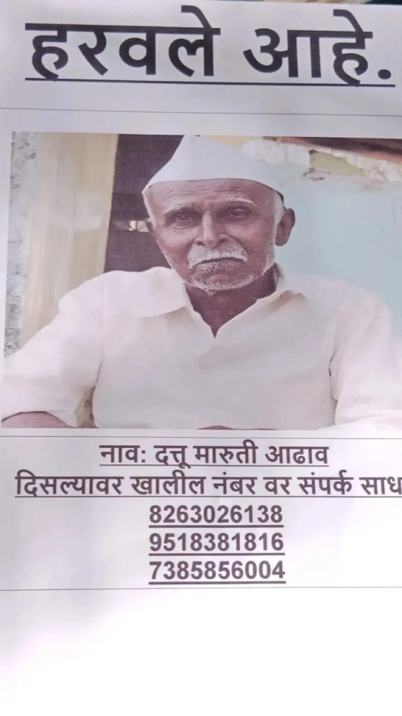 मावळ मराठा न्यूज:- लोणावळा,इंदिरा नगर न्यू तुंगारली ,लोणावळा येथील रहिवाशी असलेले दत्तू मारोती आढाव वय वर्ष ७३ हे जेष्ठ नागरिक देवघर, मुळशी येथे आपल्या नातवाच्या घरी देवाच्या कार्यक्रमाला दिनाक १६ फेब्रुवारी रोजी गेले होते.१७ फेब्रुवारी रोजी सकाळी ११ वाजता देवाच्या कार्यक्रम झाल्यानंतर ते गावात फिरायला गेले असता परत आलेच नाही .नातेवाईक आणि गावकरी यांनी संपूर्ण गाव,गावातील मंदिर सर्व जागी शोधून काढले तरी ते मिळून आले नाहीत. या संदर्भात अविनाश वामन राऊत वय वर्ष २४ राहणार देवघर ,मुळशी यांनी पौड पोलीस स्टेशन येथे मिसिंग ची तक्रार दाखल केली असून पोलीस व नातेवाईक त्यांचा शोध घेत आहेत.दत्तू मारोती आढाव यांचे वर्णन खालील प्रमाणे क्रीम कलरचा शर्ट,पांढरा पायजमा,डोक्यावर टोपी, उंची ५ फूट, सावळा रंग अश्या वर्णनाची व्यक्ती कोणास आढळल्यास किंवा सापडल्यास खालील नंबर वर संपर्क करावा ८२६३०२६१३८,९५१८३८१८१६,आणि ७३८५८५६००४ असे आवाहन नातेवाईकांनी केले आहे. सदर केस ची तपास पौड पोलीस स्टेशनचे सहाय्यक फौजदार करीत आहेत.